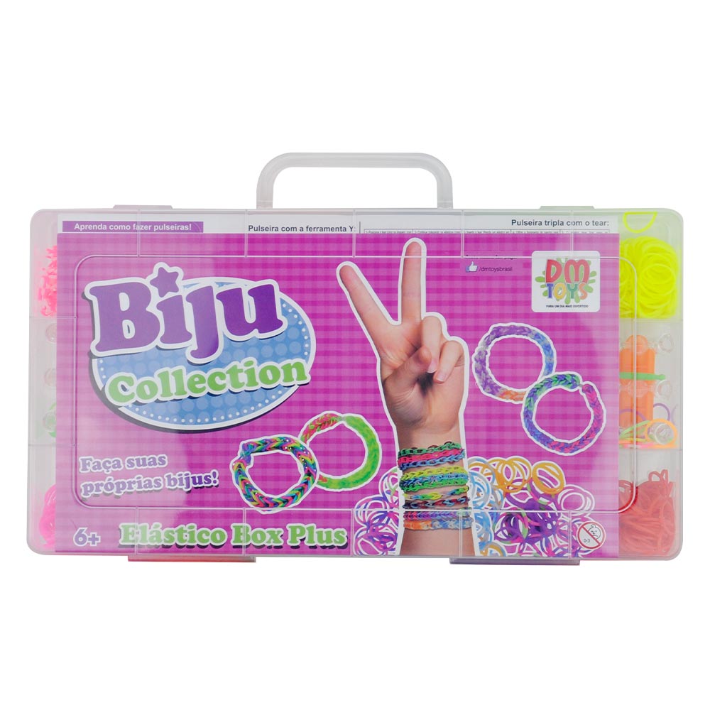 Faça as suas próprias bijus em elástico com a Biju Collection Elástico Box Plus! Com ferramenta em “y” para fazer pulseiras simples e tear para fazer pulseiras triplas! Use a sua criatividade para fazer bijuterias únicas!