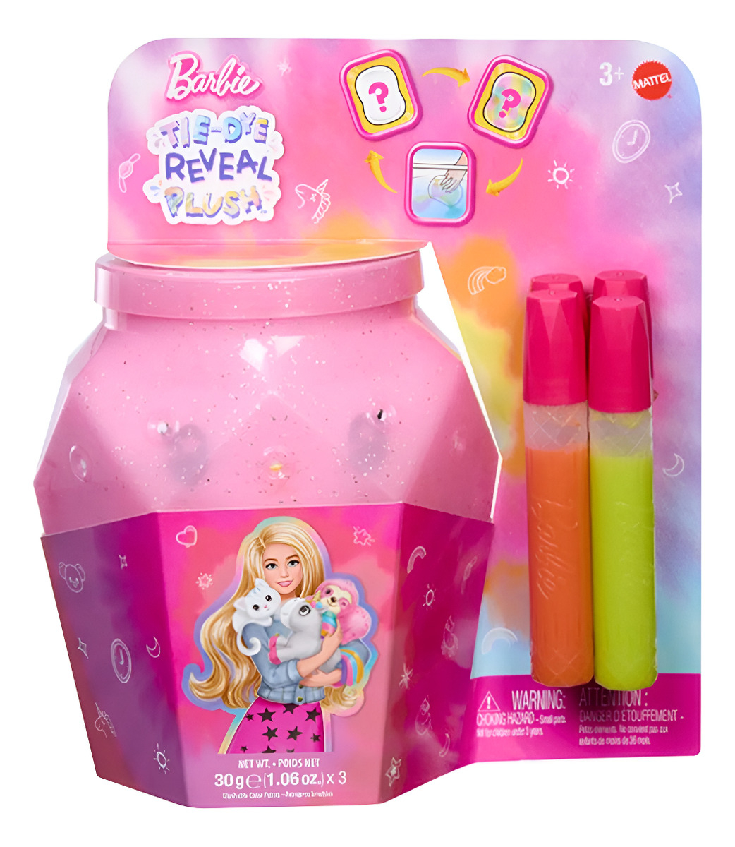 Pelucia Barbie Tie DYE Surpresa 17 CM - Mattel HWD29 As crianças podem personalizar a sua própria pelúcia com a coleção Barbie Tie-Dye. Cada kit contém 3 cápsulas coloridas e uma pelúcia misteriosa da Barbie dentro de uma caixa especial que é revelada em quatro etapas fáceis: Enxaguar com água, inserir as cápsulas nos orifícios de câmera, expremer o excesso de tinta pelo orifício de drenagem e, a seguir, remover e revelar a pelúcia. Este animal fofinho é perfeito para abraçar. E os jovens estilistas podem levá-lo e repetir a operação indefinidamente.